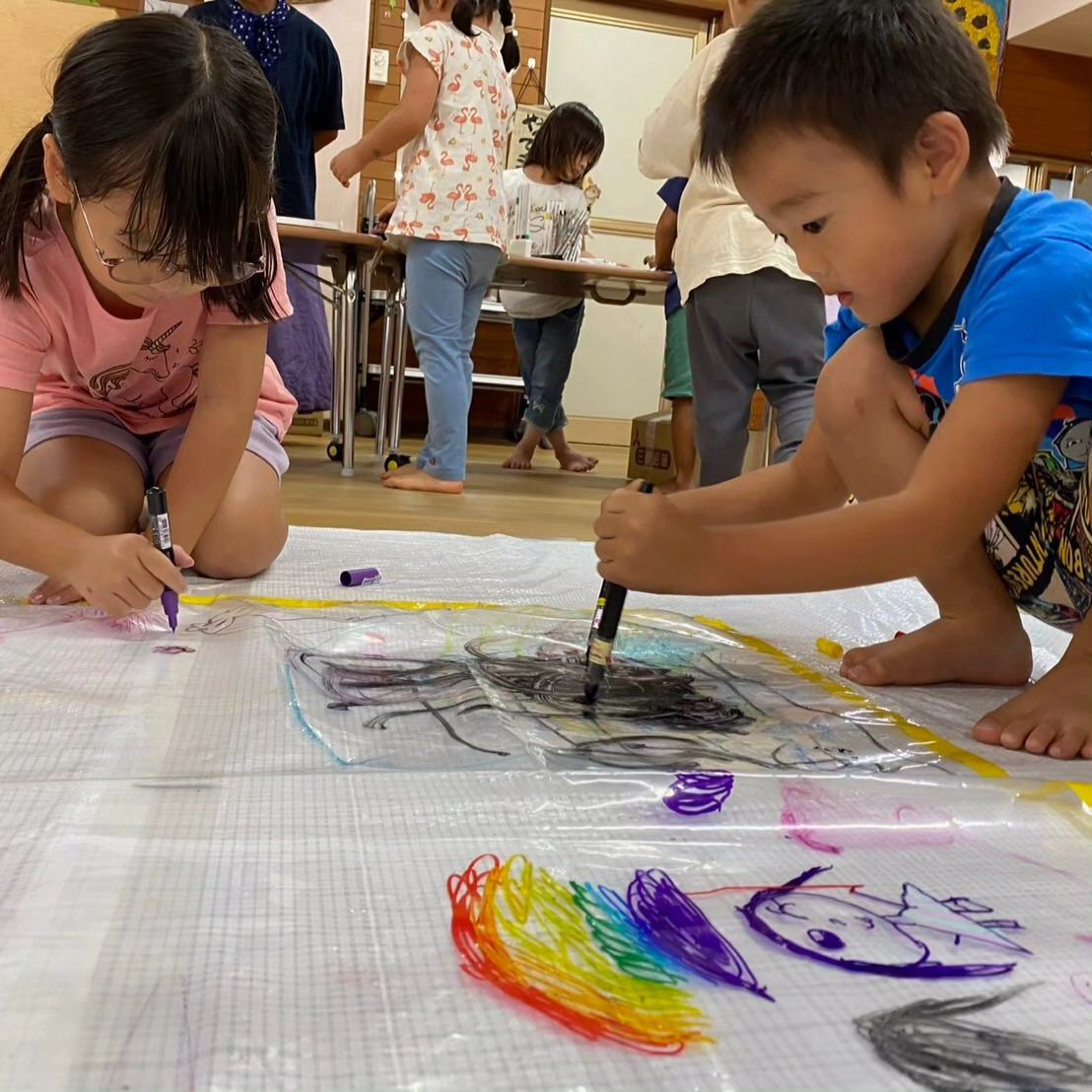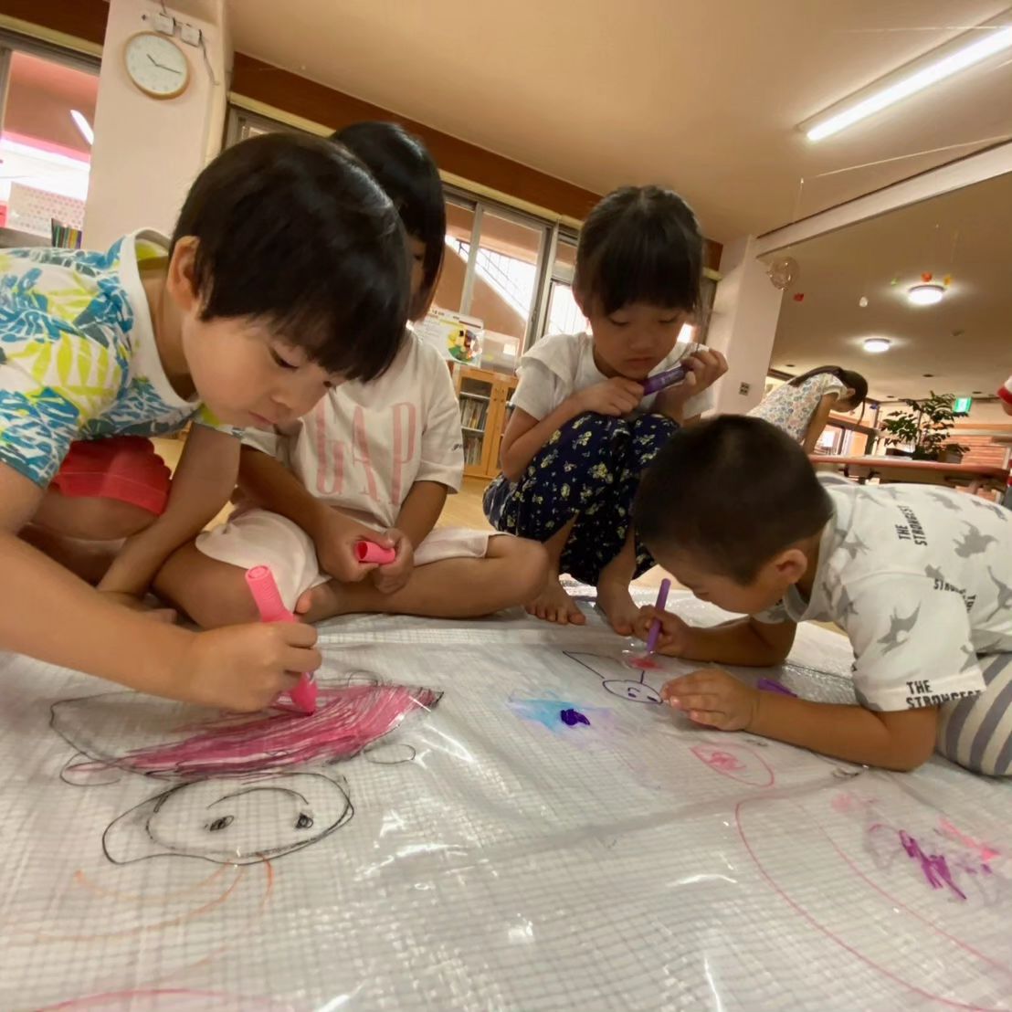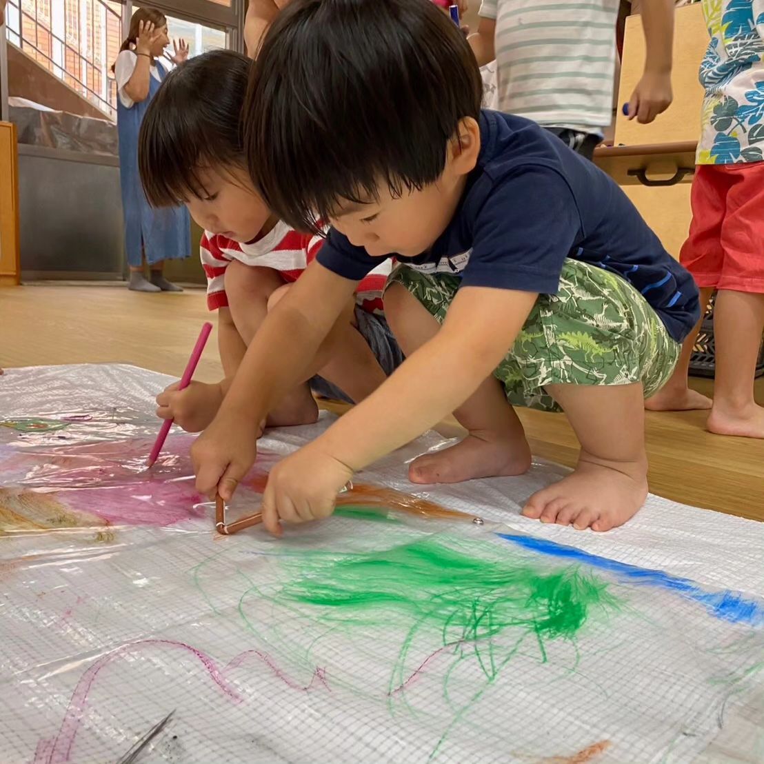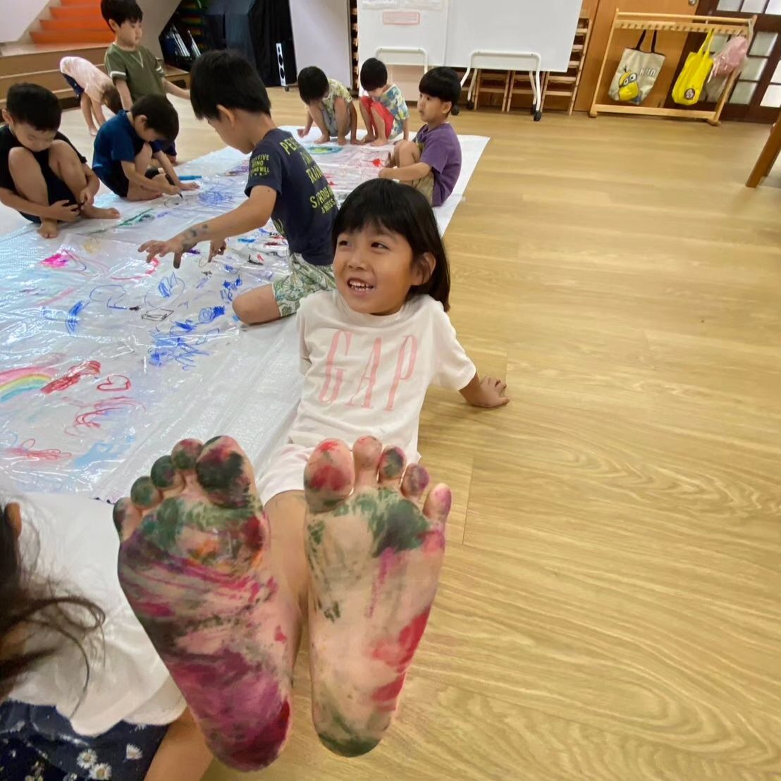 ビニールシートの上に描いているので気が付けば身体のあちこちにも。