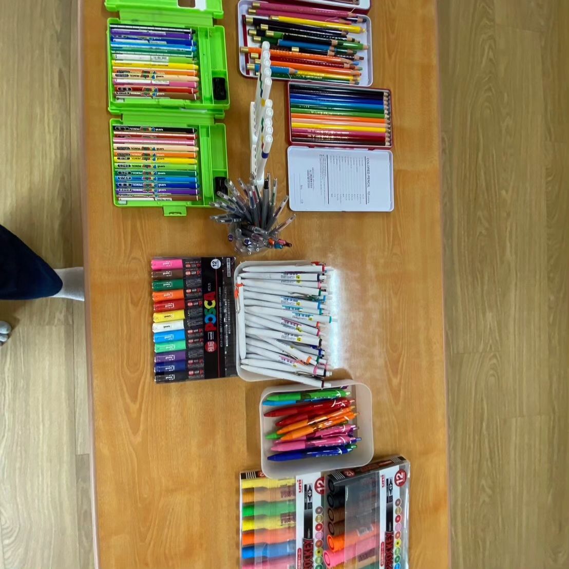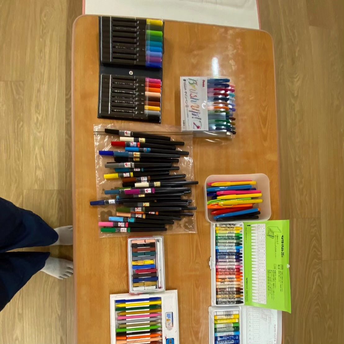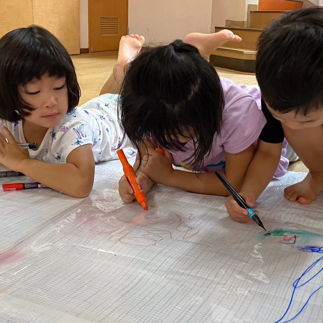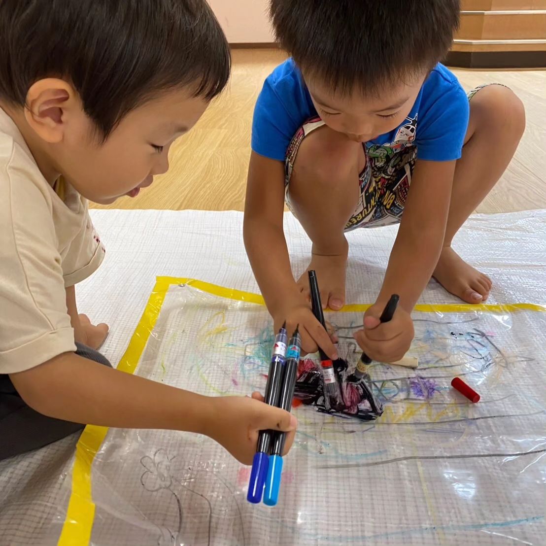 ビニールシートの上に描いているので気が付けば身体のあちこちにも。
