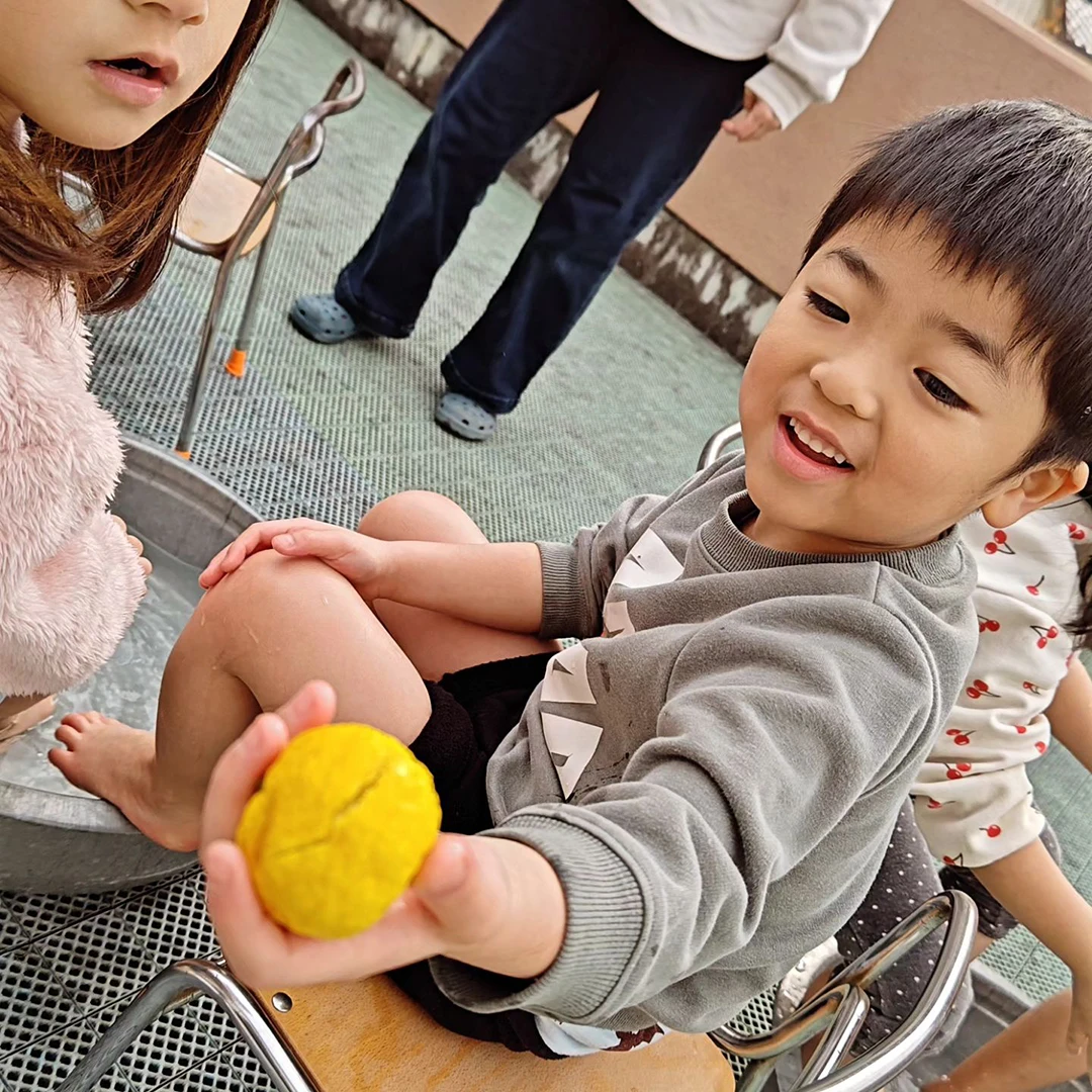 お湯に柚子の実を入れると、香りが濃くなって、こども達、手にとって匂いをかいでは『いい匂いやなぁ~』と笑顔になってました😄