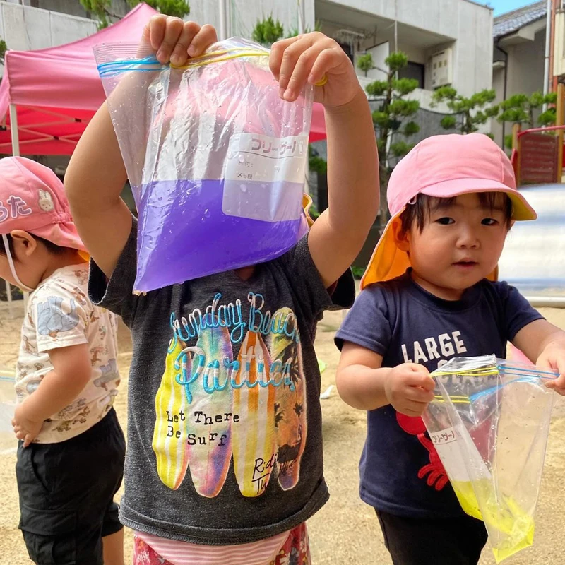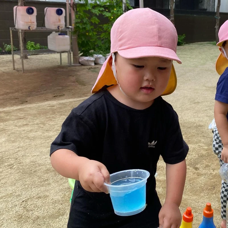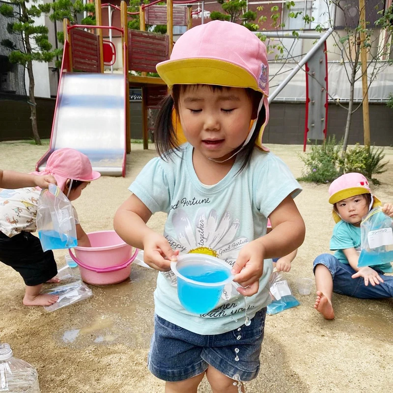 三原色の絵の具で少し色をつけると、わぁ〜ジュースみたい🥰とこども達はテンション⇧⇧⇧