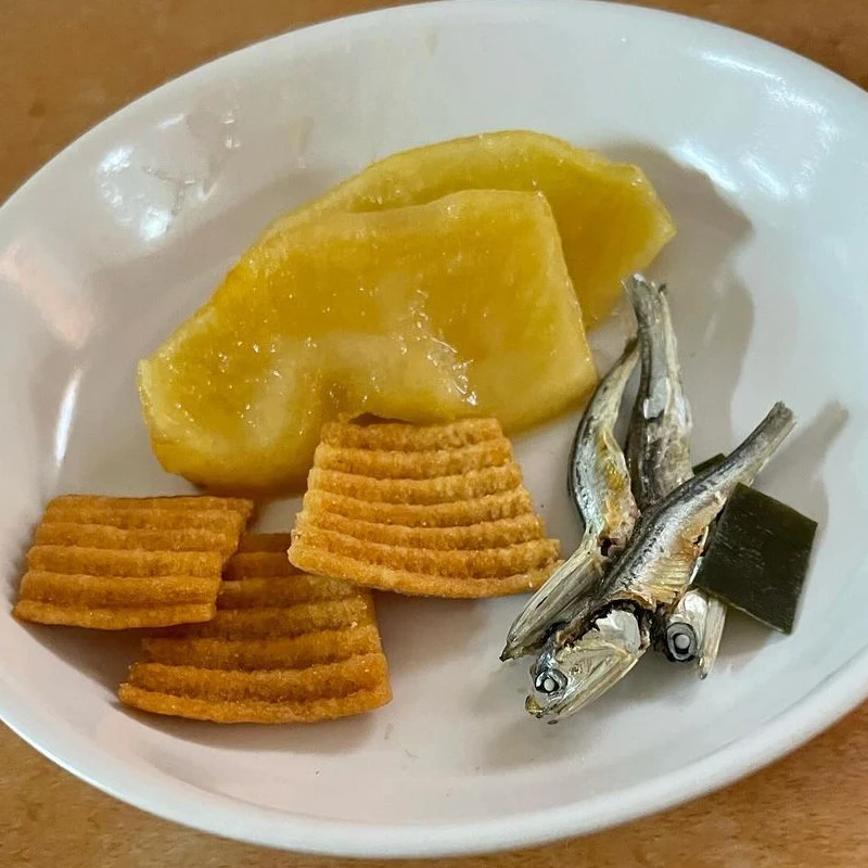そして本日のおやつは、焼きリンゴ、いりこ、きらず揚げです。