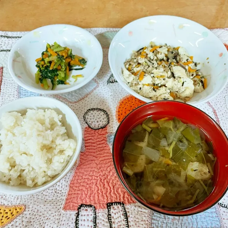 メニューは、いりとうふ、小松菜のおひたし、空芯菜の味噌汁です。