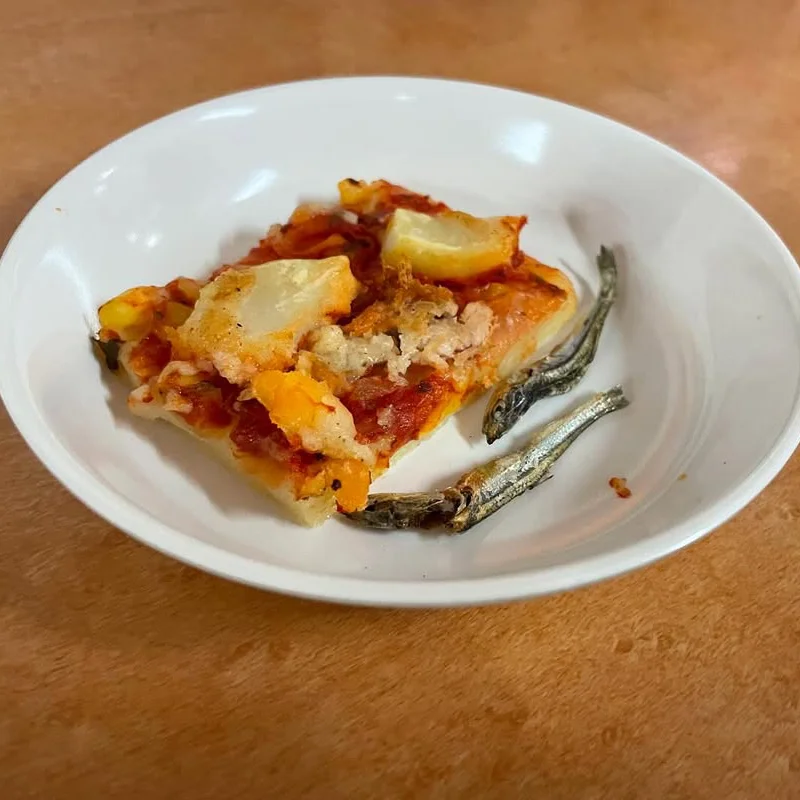 おやつは、手づくり「ツナとコーンとのピザ」です。