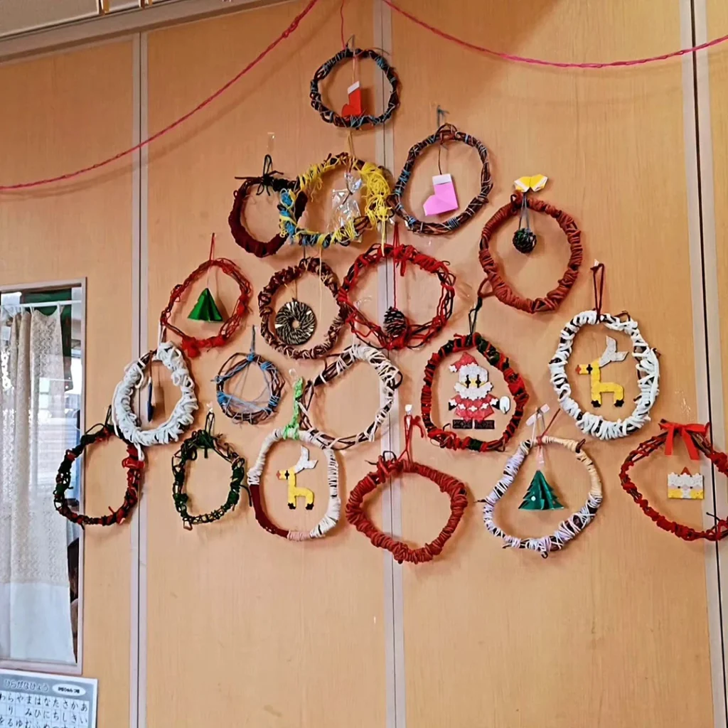 クリスマスメニューは、可愛い型抜きご飯と米粉のからあげ、コーンスープ。おやつはふかふかのイチゴトッピングのケーキ💕