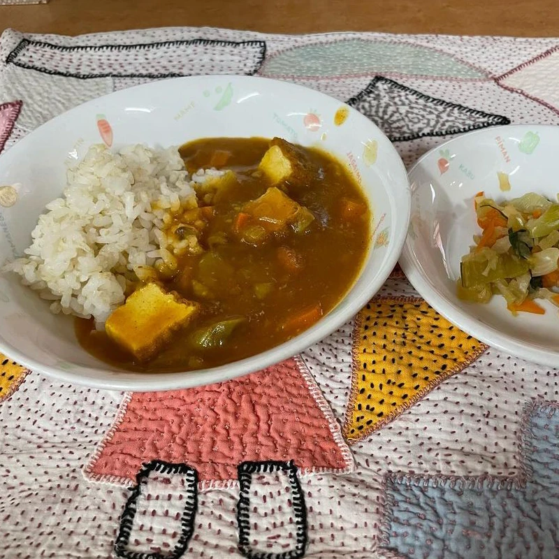 神田保育園のある日の手づくり給食。 メニューは、春やさいのオリジナルカレー、切干大根のサラダです。