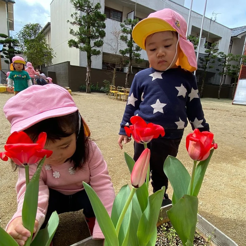 うたを歌いながらチューリップ🌷を覗き込む、小さな人。