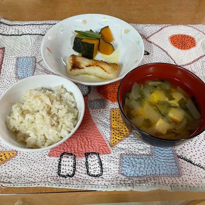 神田保育園のある日の手づくり給食。 メニューは、かれいの塩焼き、かぼちゃの含め煮、春キャベツの味噌汁です。